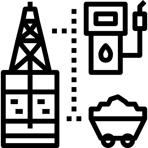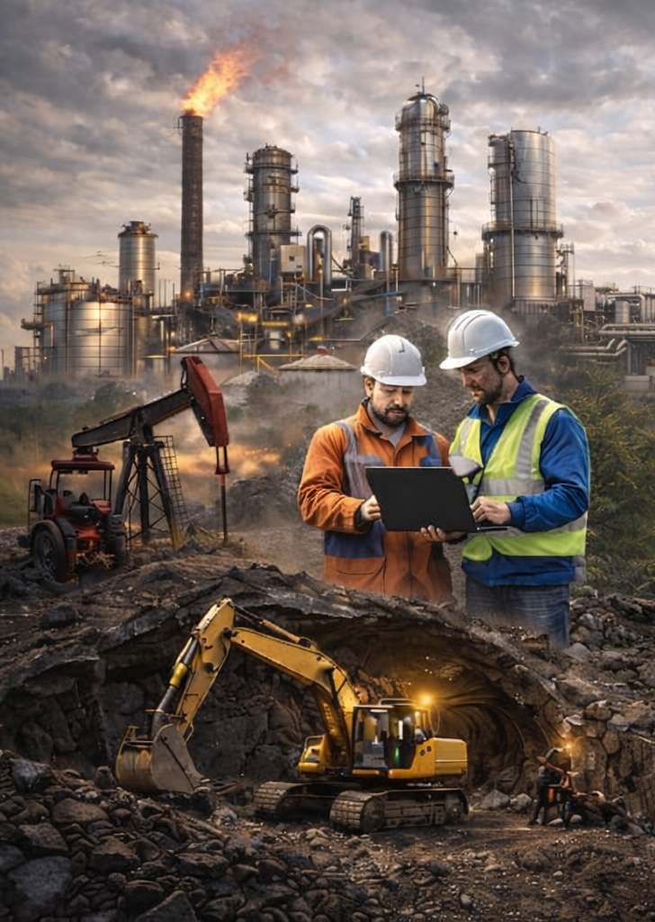 Coal excavation and mining operations, alongside oil refining processes, convert crude resources into energy products globally.